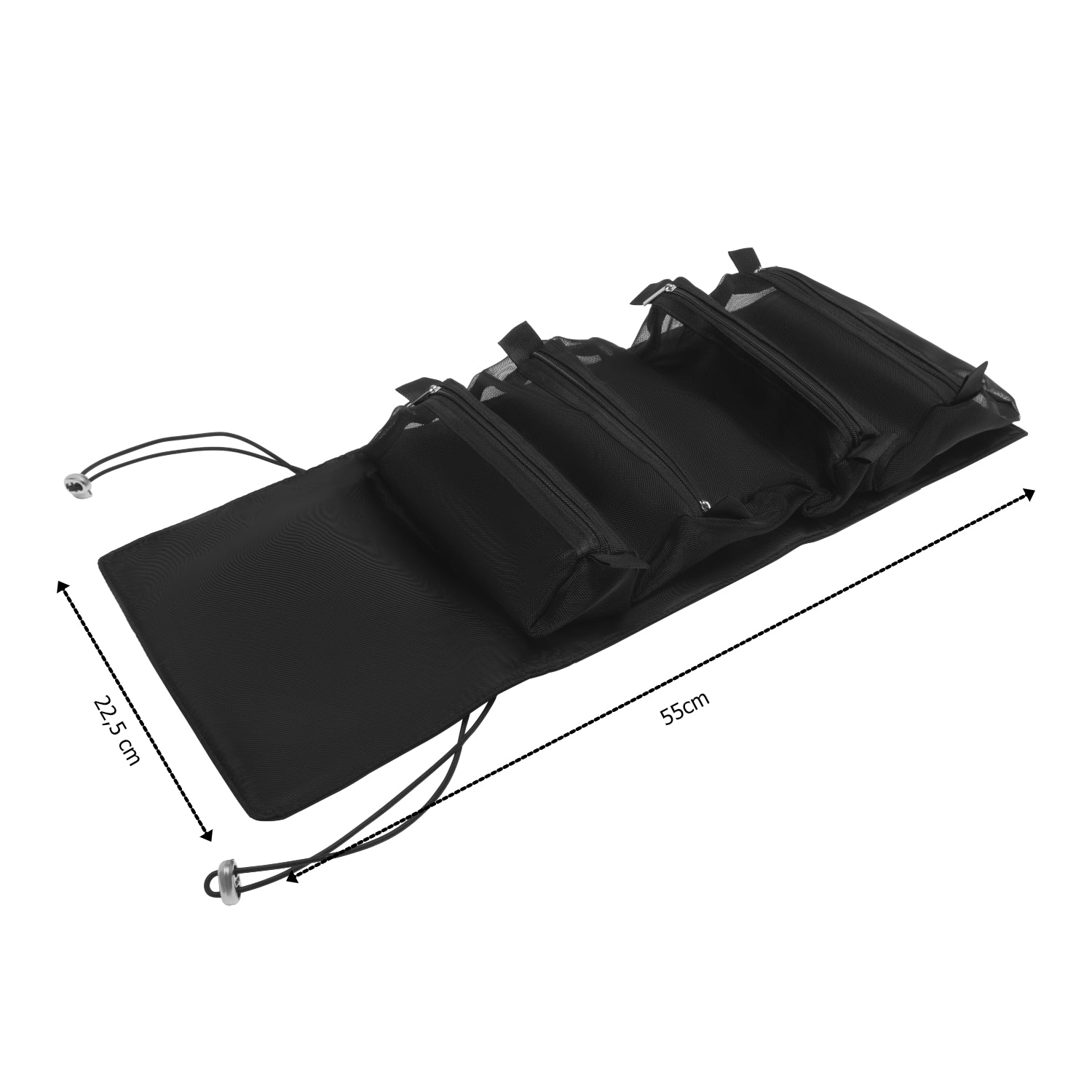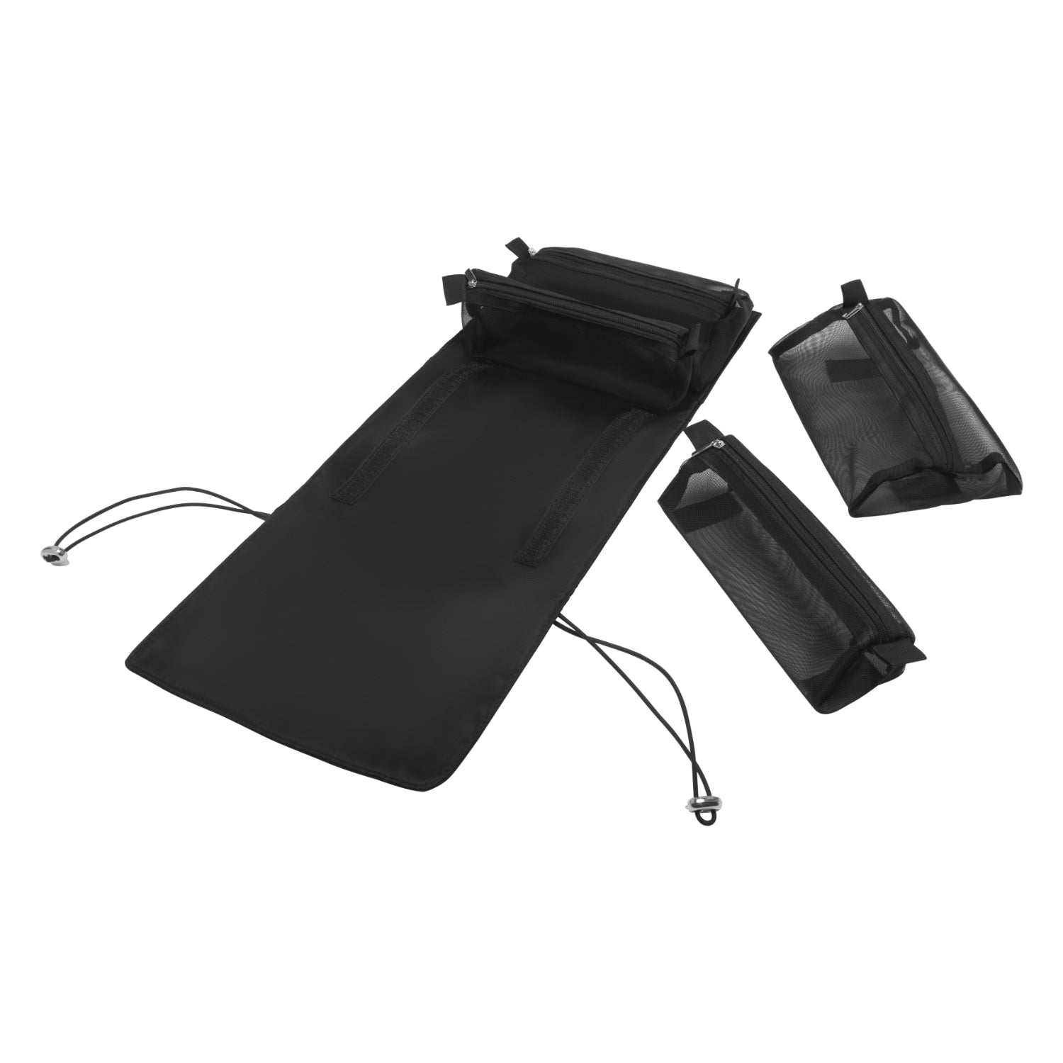 This makeup bag is designed to maximize storage while minimizing clutter. It features four modular pockets, each zippered and made of water-resistant mesh fabric. The pockets are fully removable, allowing for personalized organization. The foldable design of the kit makes it easy to carry and store.